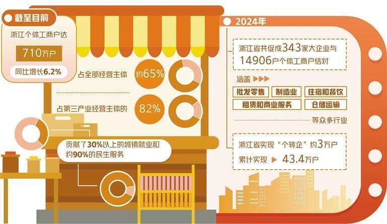 作为市场经济的“毛细血管”和“神经末梢”,个体工商户在稳增长、促就业、惠民生等方面发挥着重要作用。浙江是民营经济大省,个体工商户数量多、活力足、韧性强,是浙江经济家底中的家底。截至目前,浙江个体工商户达710万户,同比增长6.2%,占全部经营主体的约65%,占第三产业经营主体的82%,贡献了30%以上的城镇就业和约90%的民生服务。浙江不断推出促进个体经济健康发展的有力举措,就是为了让“小个体”释放“大活力”。
